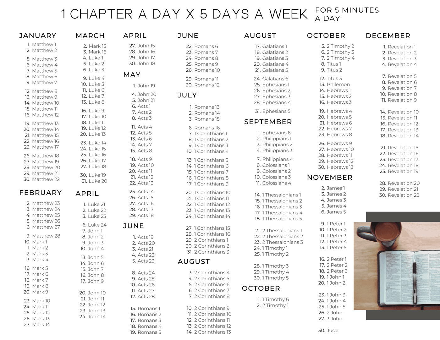 You'll complete the entire New Testament in a year by spending just five minutes a day!